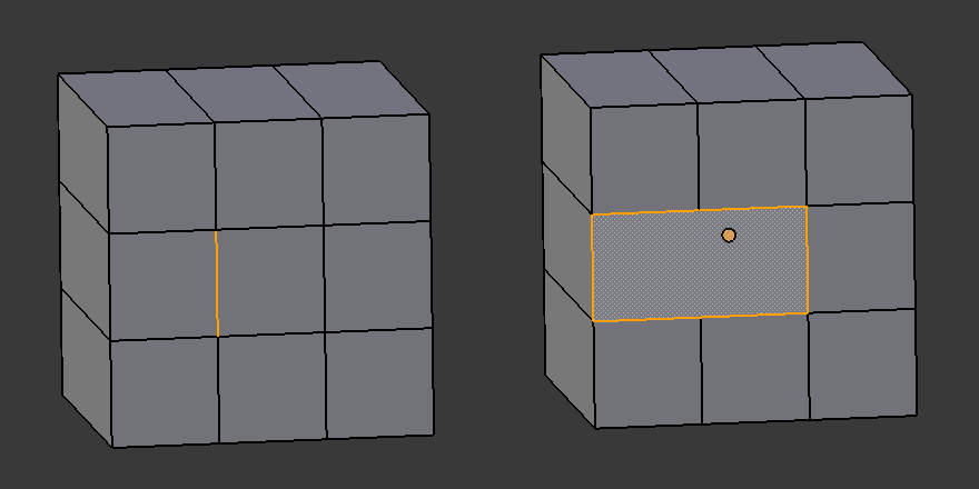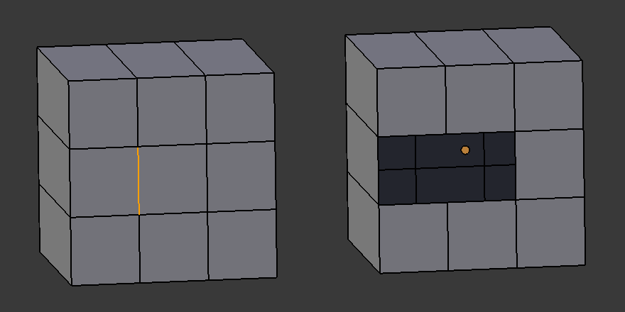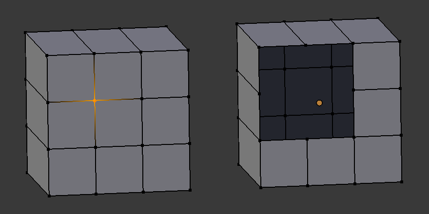 削除 (Delete) を実行すると選択要素に接する要素を巻き込む形で削除され、融解 (Dissolve) を実行すると選択要素のみが削除されます。 下記の例でそれぞれの振る舞いの違いを理解してください。
