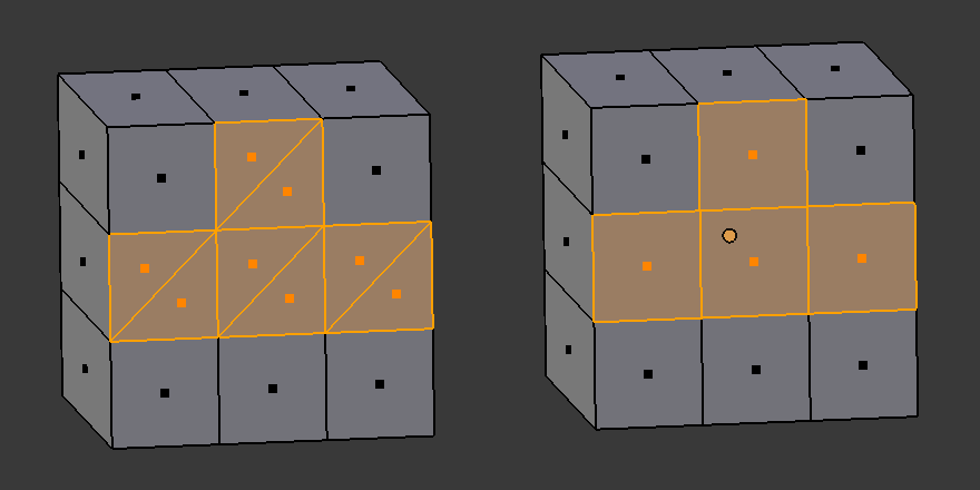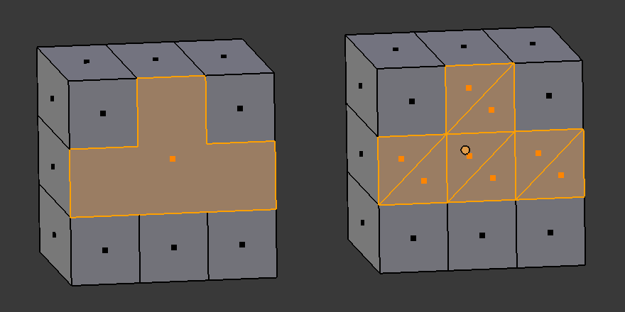 融解を行っていると、面が複雑な形になってしまうことがあります。 ポリゴンを四角面だけの構成にしたいときは、Ctrl + T で三角面に分割し、さらに Alt + J で四角面に結合します。