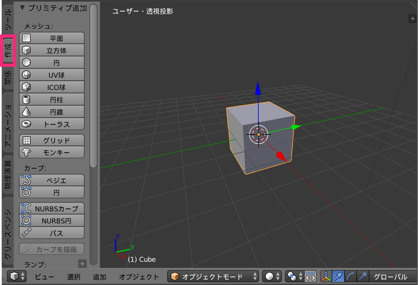 ツールバーの「作成」タブから、任意のオブジェクト(メッシュ)を追加することができます。 3D エディタにツールバーが表示されていない場合は、3D エディタの左上にある [+] アイコンをクリックするか、3D エディタ内にマウスカーソルを置いた状態で T を押すと表示されます。