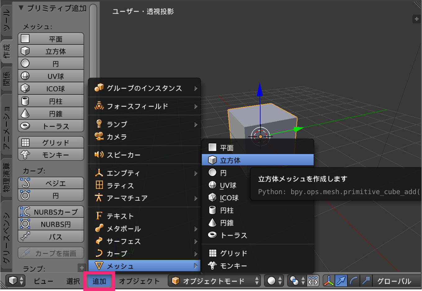 3D エディタの下にある、ヘッダの「追加」メニューから、任意のオブジェクト(メッシュ)を追加することができます。