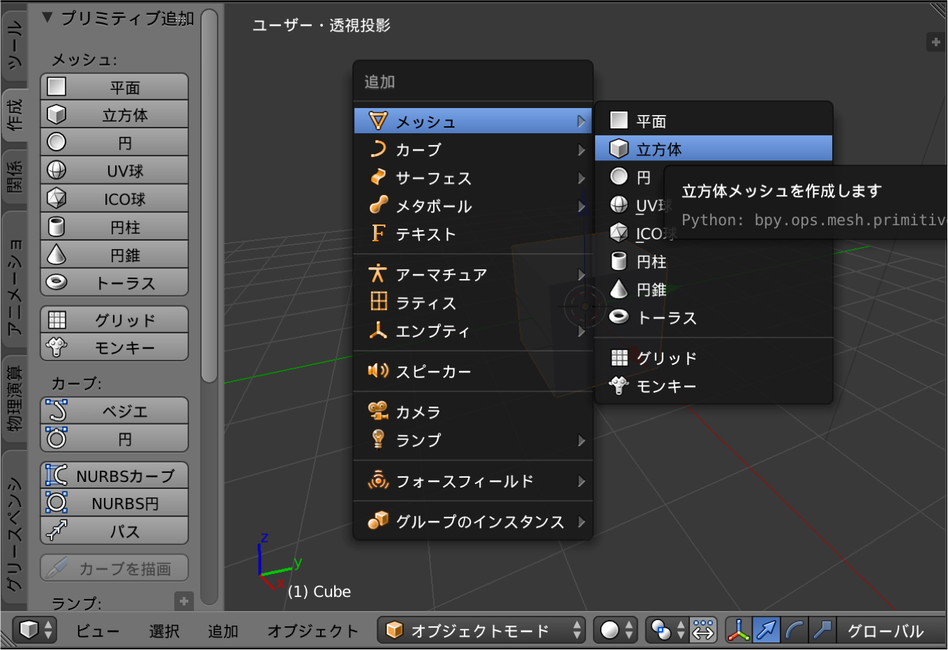 3D エディタ内にマウスカーソルがある状態で、Shift + A と入力すると、オブジェクト(メッシュ)を追加するポップアップを表示することができます。
