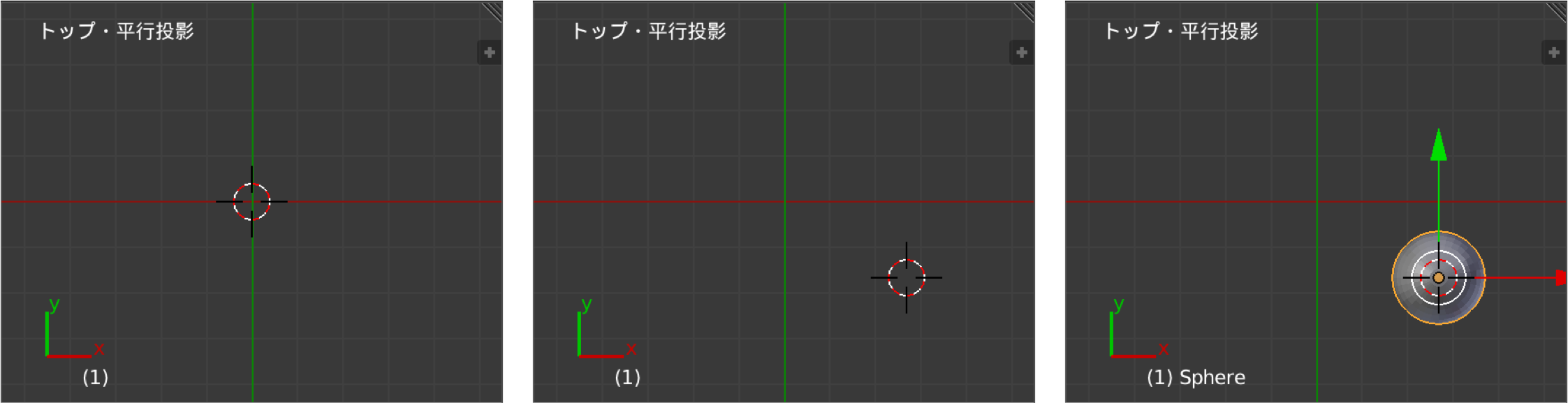オブジェクトを追加した時の初期位置は、3D エディタに表示された 3D カーソル(赤白の円と十字線)の位置になります。 3D カーソルは、マウスの左クリックで任意の位置に移動させることができます。