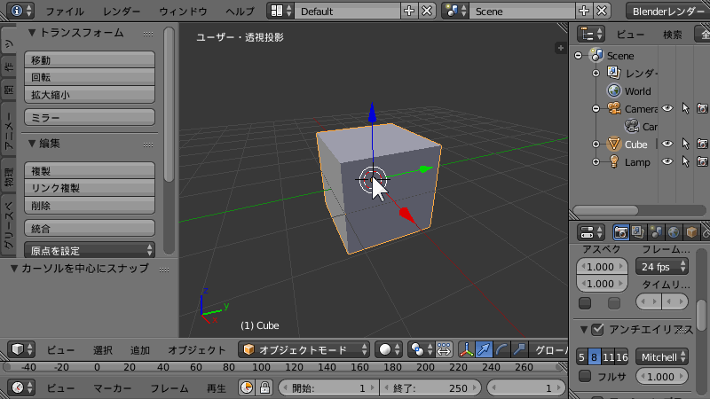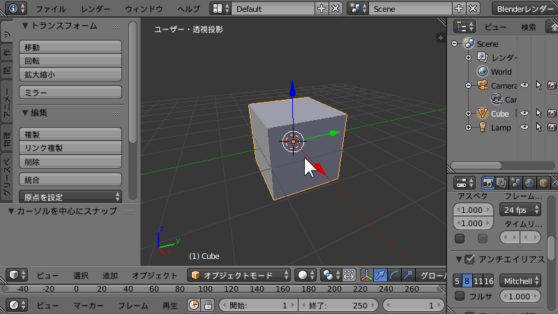 任意のエディタ(上記の例では 3D ビュー)の上にマウスカーソルがある状態で、Shift-Space を押すと、そのエディタをウィンドウいっぱいに表示することができます(インフォエディタ以外の他のエディタが非表示になります)。 もう一度同じ操作を行うと、元の表示に戻ります。