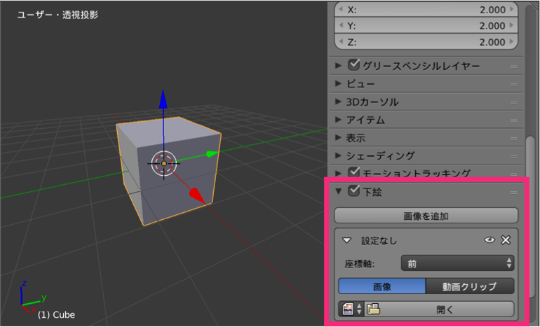 プロパティシェルフの下の方にある、下絵というところで下絵の設定を行います。