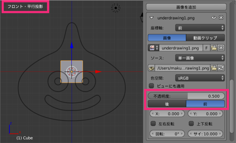 画像ファイルを選択すると、画像の表示方法に関する設定項目が表示されます。 後/前というボタンは、下絵をオブジェクトの後ろに表示するか、前に表示するかを設定します。 ここでは、下絵がオブジェクトに隠れて見えなくならないように、[前] を選択します。 不透明度の設定ができるため、下絵を前に表示しても、オブジェクトが見えなくなってしまうことはありません。