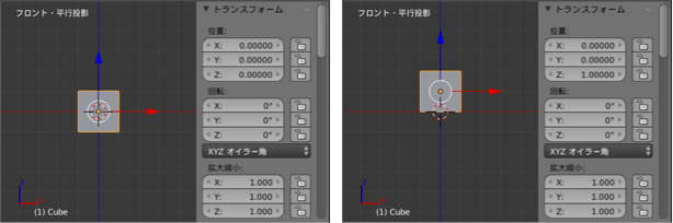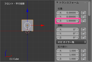 上記は、テンキーの 1 を押して、正面からの視点に切り替えた画面で、z軸方向へ1単位だけオブジェクトを動かしています。 実際には、このくらいの操作であれば、青色矢印を Ctrl キーを押しながらドラッグする操作の方が簡単ですね。